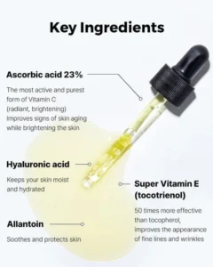 Ascorbic Acid (Vitamin C 23%): Delivers potent brightening and anti-aging effects while protecting against free radicals