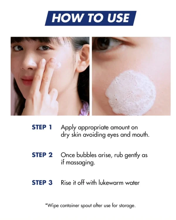 Apply a thin layer to dry skin, avoiding the eye area. Allow bubbles to fully form for 3–5 minutes. Gently massage the foam into your skin using circular motions, then rinse off with lukewarm water. Use 2–3 times a week for best results.