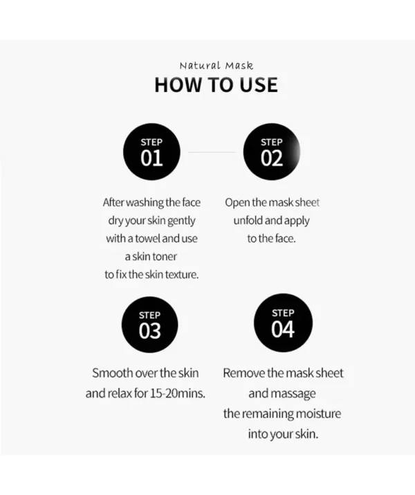 After cleansing and toning, apply the mask evenly over your face. Leave on for 15–20 minutes. Remove the sheet and gently pat any remaining essence into the skin until fully absorbed. Follow with moisturizer if needed. Use 2–3 times per week or as desired.