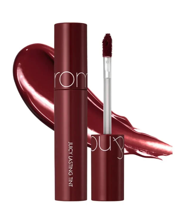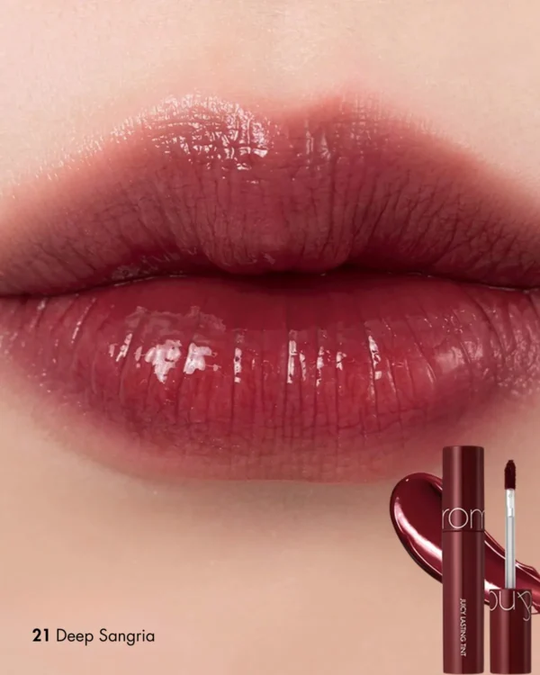 Meet your lips’ ultimate fusion of gloss and color—the Rom&nd Juicy Lasting Tint 21 Deep Sangria (5.5 g).