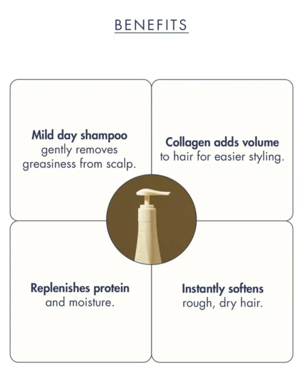Formulated with hydrolyzed collagen and botanical extracts, this nutrient-rich shampoo strengthens weakened hair while replenishing lost moisture. It creates a soft, creamy lather that gently lifts away dirt, oil, and buildup from the scalp without stripping essential oils.